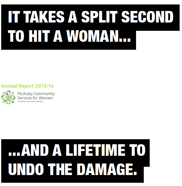 MediaWise researched, wrote and edited McAuley Community Services for Women’s annual report. The theme was based on an advertisement with the catchline It takes a split second to hit a woman…and a lifetime to undo the damage. The advertisement was the front cover, immediately spelling out the tone and intent of the annual report.